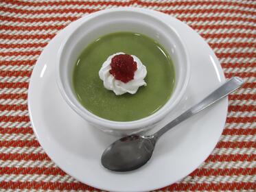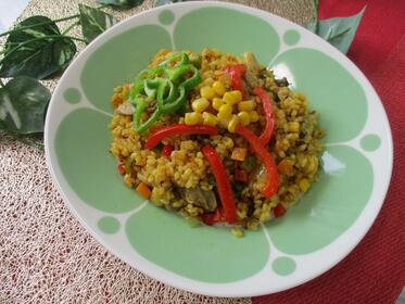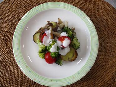 チキンカレーピラフ、ホットサラダ、抹茶プリン