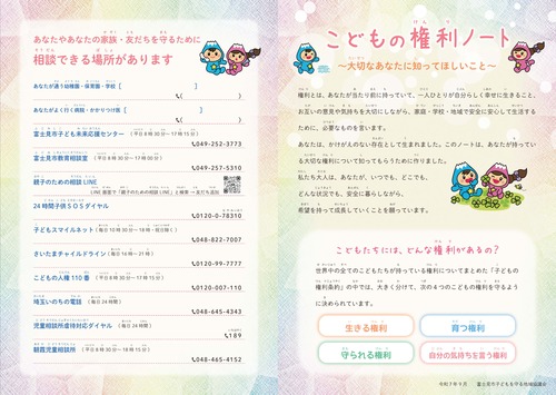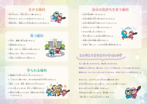 権利とは、こどもたち全員が当たり前に持っていて、一人ひとりが自分らしく幸せに生きること、お互いの意見や気持ちを大切にしながら、家庭・学校・地域で安全に安心して生活するために、必要なものを言います。こどもであるみなさんが持っている大切な権利について知ってもらうために「こどもの権利ノート」を作りました。