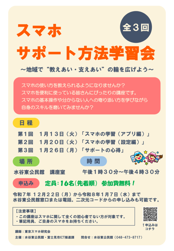 お申込みは公民館窓口、お電話で受け付けています。また、チラシの二次元コードからもお申し込みできます。