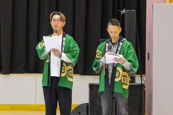 ステージイベントで司会を務めた(左から)富士見市PR大使の今成亮太さん、商工会青年部の坂口和寛さん