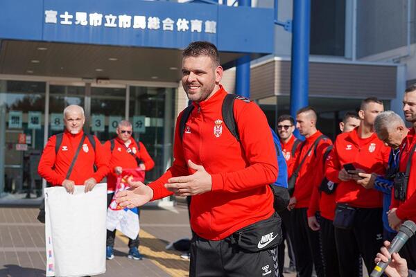 市民からの応援メッセージの寄せ書きや壮行試合を観戦した諏訪小学校の子どもたちからの応援メッセージ入りセルビア国旗などをお渡しし、選手団からはサインボールの贈呈がありました。