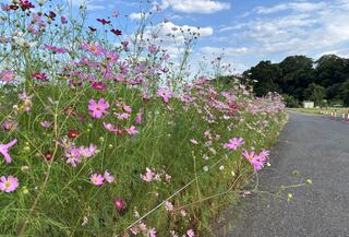 「コスモス街道」の愛称で親しまれ、水谷小学校区まちづくり協議会のみなさんが中心となって、種まきや除草作業に取り組んでいます。見頃:9月末から10月中旬