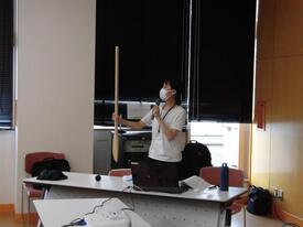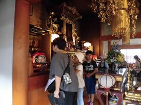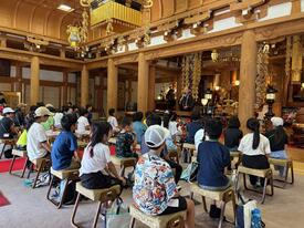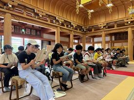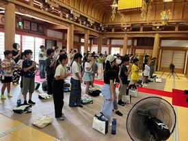 7日目はみんなで大應寺におじゃましました!まずは住職のお話を聞き、三帰礼文というお経を唱えます。漢字が多く内容が難しいところもありましたが、お経を唱えるという貴重な体験をすることができました!次に本堂、薬師堂、観音堂などを見学し、住職から仏像や掛け軸についての説明を聞きました。最後はいよいよ礼拝行と座禅です!礼拝行は正座と起立の姿勢を108回繰り返し行うそうですが、今回は半分の54回で行いました。その後は胡坐の体勢になり、5分間集中して座禅を体験することができました!仏教について学びを深めることができた、あっという間の2時間でした☆
