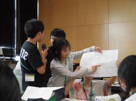 講義の後は卒業試験!試験内容は「子ども大学とは?」と「富士見市のいいところは?」の2つのテーマで、ひとことレポートを作成すること!班のみんなと一緒に考えて、みんなで協力して、班ごとにひとことレポートを作成し、みんなの前で発表しました。