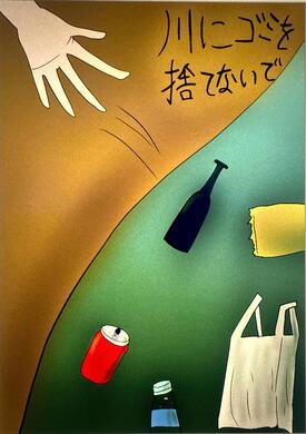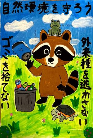 生き物が好きで、川などに生き物を探しに行くと、外来種が多く、ゴミも捨てられていて残念な気持ちになります。アライグマ、ウシガエル、アカミミガメは増えていると知りました。日本の生き物が多く、きれいな自然環境が良いと思い、外来種問題とゴミ問題をいっしょに、このポスターを書きました。