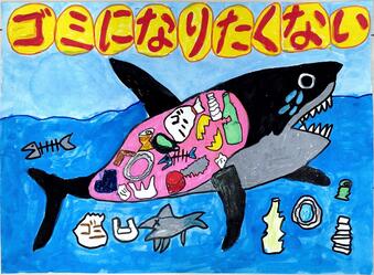 海にゴミがたくさん捨てられている事をテレビで知りました。そのゴミを、僕が好きなサメが、エサと間違えて食べていると思うとかわいそうになりました。サメの気持ちになって、それを絵にかきました。海からゴミがなくなって欲しいです。